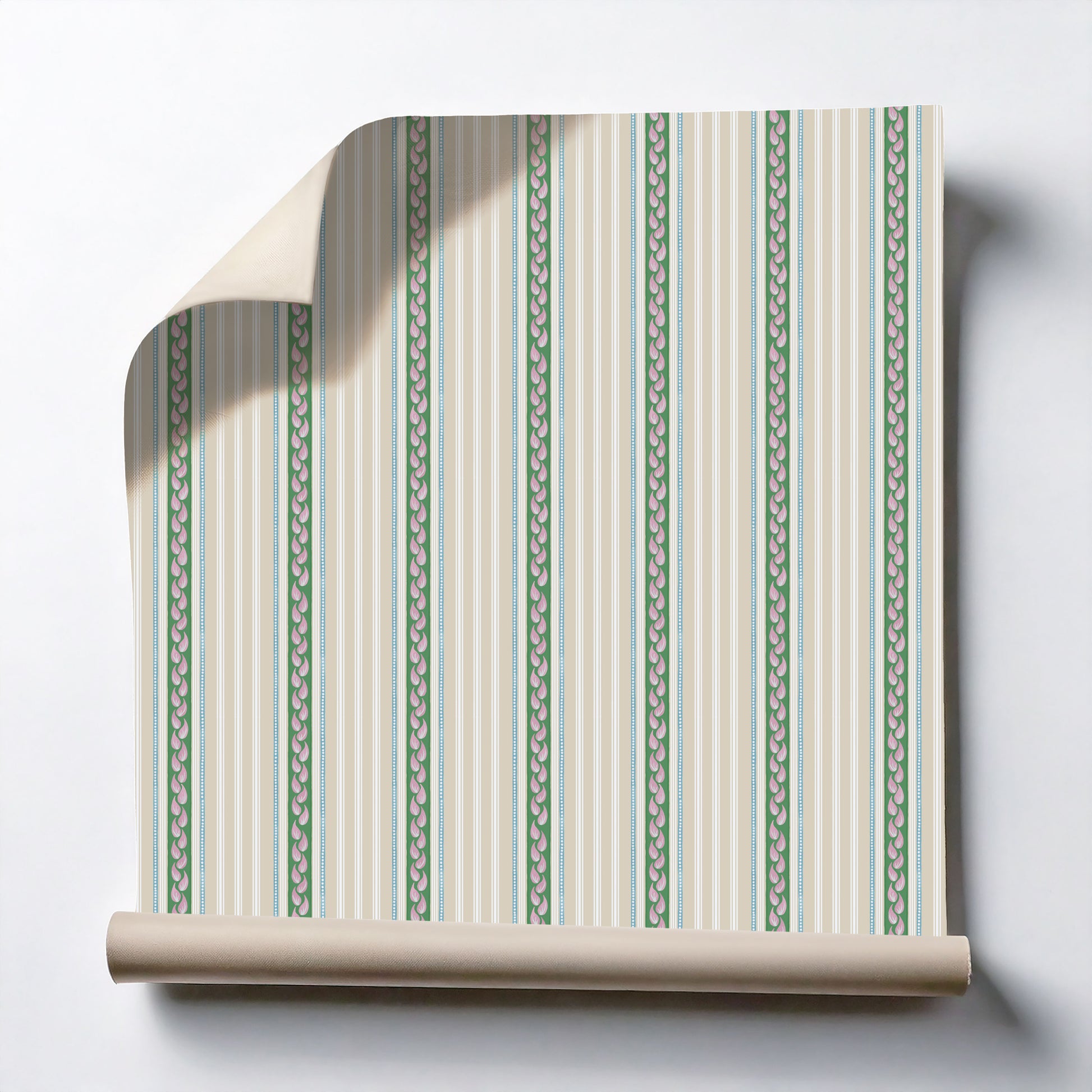 Our stripes pattern features neutral stripes flanked by floral-inspired green, pink, and blue motifs.
